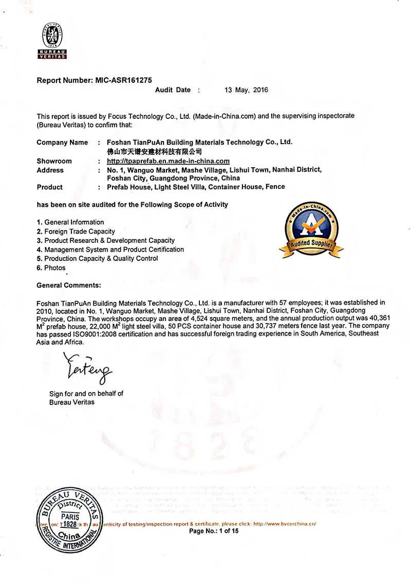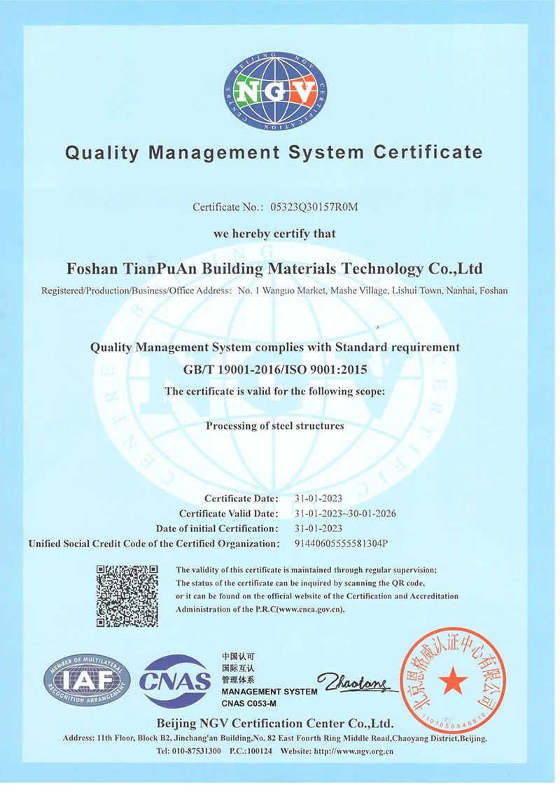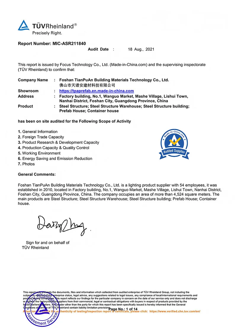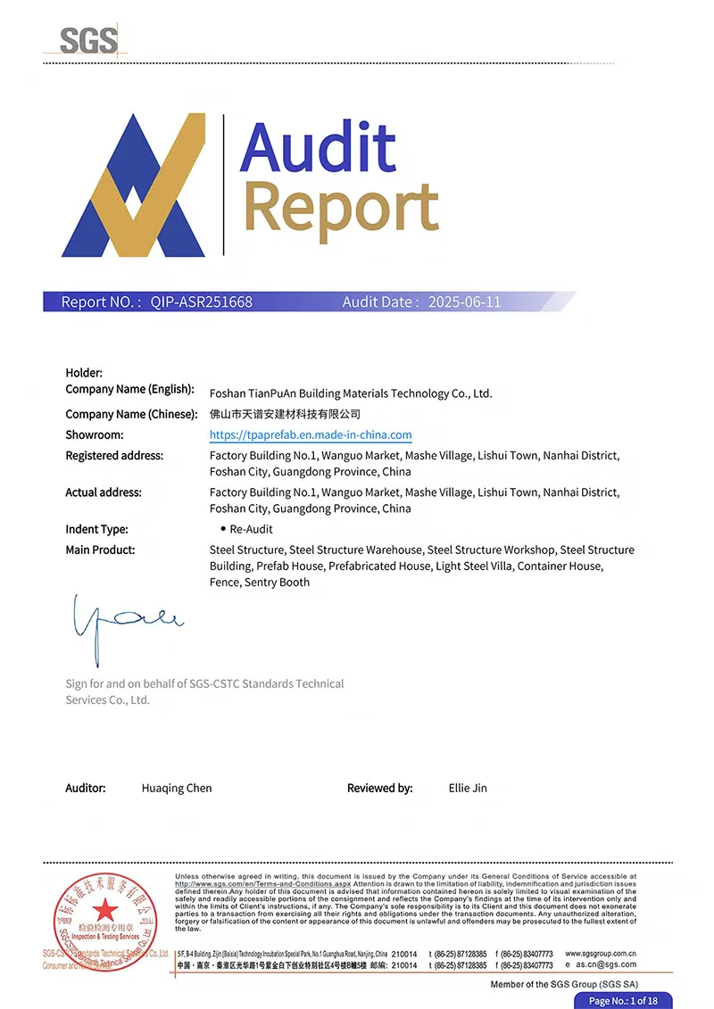 Fundada en 2008, Foshan TianPuAn Building Materials Technology (TPA Housing) se ha consolidado como un proveedor integral de soluciones en estructuras de acero, ofreciendo todo lo necesario para llevar su proyecto del papel a la realidad. Nuestro servicio abarca consultoría especializada, diseño personalizado, fabricación de alta precisión, instalación en obra o asistencia técnica, así como gestión completa de proyectos. Somos expertos en fabricación de estructuras de acero, talleres industriales y edificios prefabricados, poniendo a su disposición una amplia gama de productos y soluciones para adaptarnos a las necesidades específicas de cada cliente y garantizar resultados sólidos, duraderos y eficientes.
